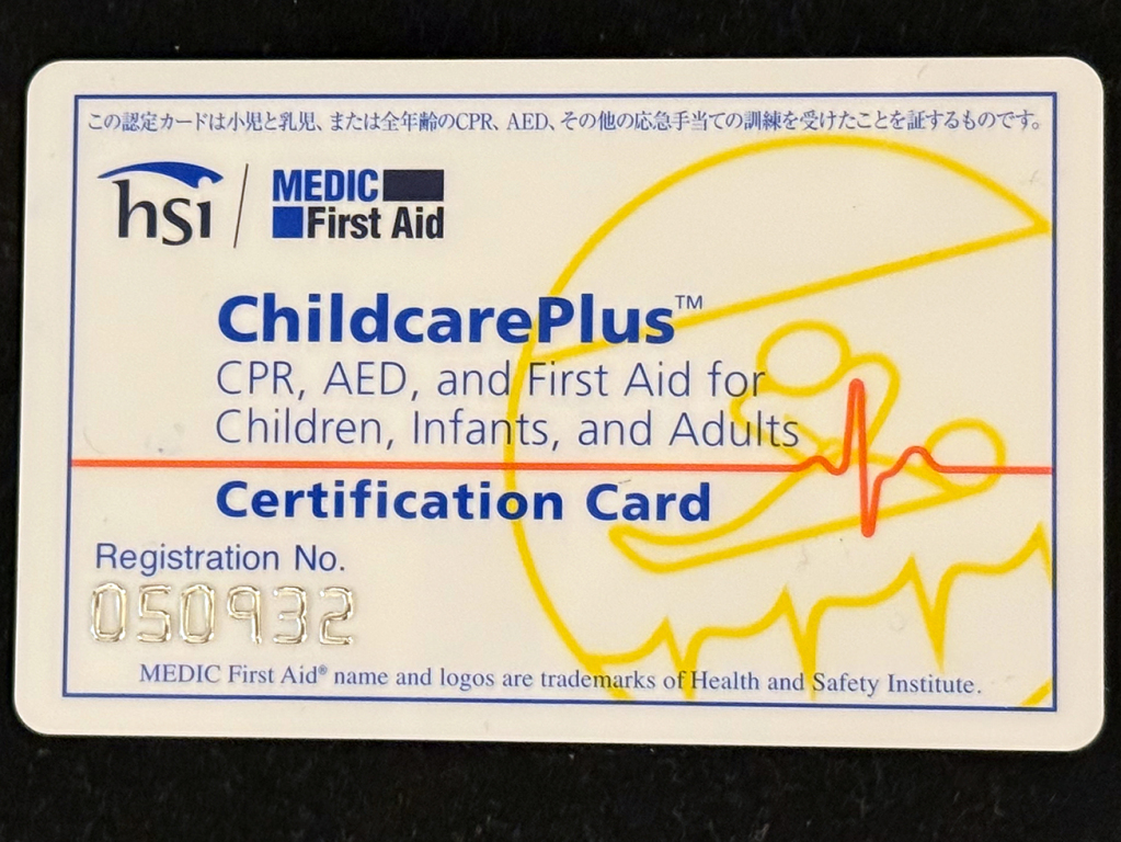小児を含む全年齢のCPR/AEDの講習はすでに他で受けているので、ファーストエイドのみ受講したいなどの場合にはこちらのプログラムが適しています。(復習のためにも、CPR/AEDの講習をやりたいという方は、ChildcarePlus™(チャイルドケアプラス)をお申し込みください)
